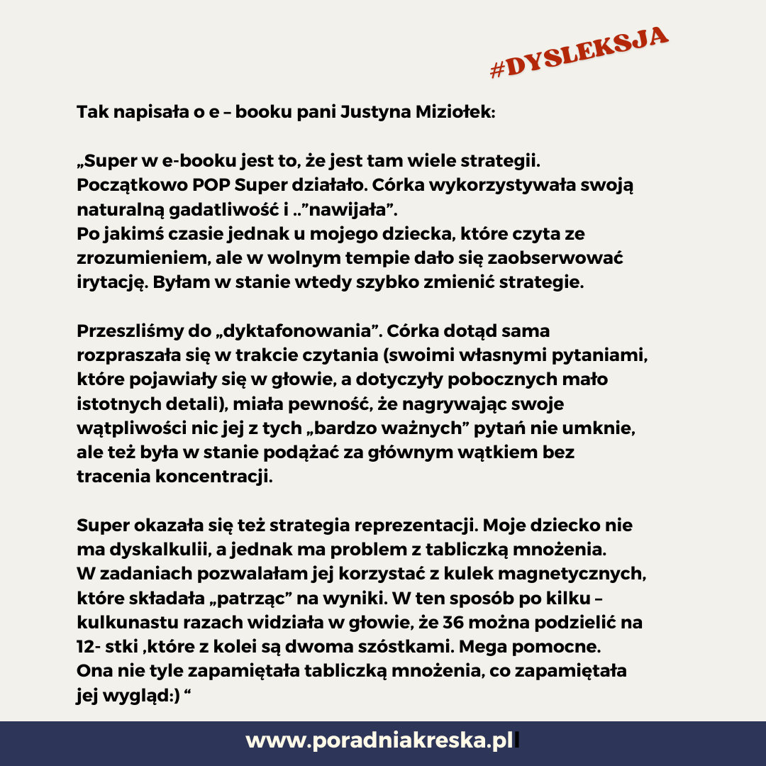 „Super w e-booku jest to, że jest tam wiele strategii. Początkowo POP Super działało. Córka wykorzystywała swoją naturalną gadatliwość i ..”nawijała”. Po jakimś czasie jednak u mojego dziecka, które czyta ze zrozumieniem, ale w wolnym tempie dało sie zaobserwować irytację. Byłam w stanie wtedy szybko zmienić strategie. Przeszliśmy do „dyktafonowania”. Córka dotąd sama rozpraszała się w trakcie czytania (swoimi własnymi pytaniami, które pojawiały się w głowie, a dotyczyły pobocznych mało istotnych detali), miała pewność, że nagrywając swoje wątpliwości nic jej z tych „bardzo ważnych” pytań nie umknie, ale też była w stanie podążać za głównym wątkiem bez tracenia koncentracji.