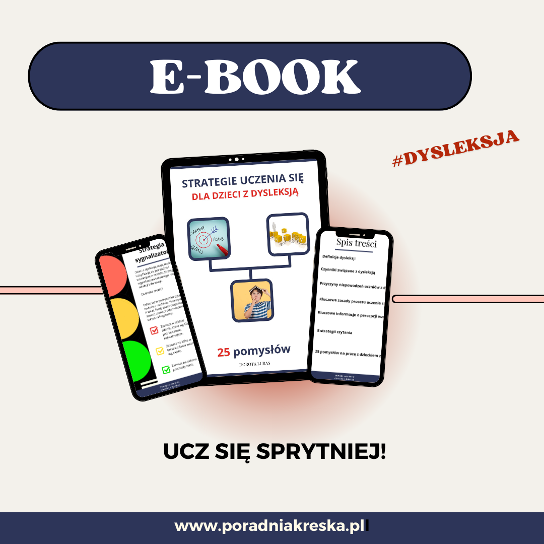 E – book jest przewodnikiem dla rodziców dzieci z dysleksją. Składa się z części teoretycznej – zawiera podstawowe wiadomości o dysleksji i uczeniu się oraz z części praktycznej – 25 strategii uczenia się dla dzieci z dysleksją.
